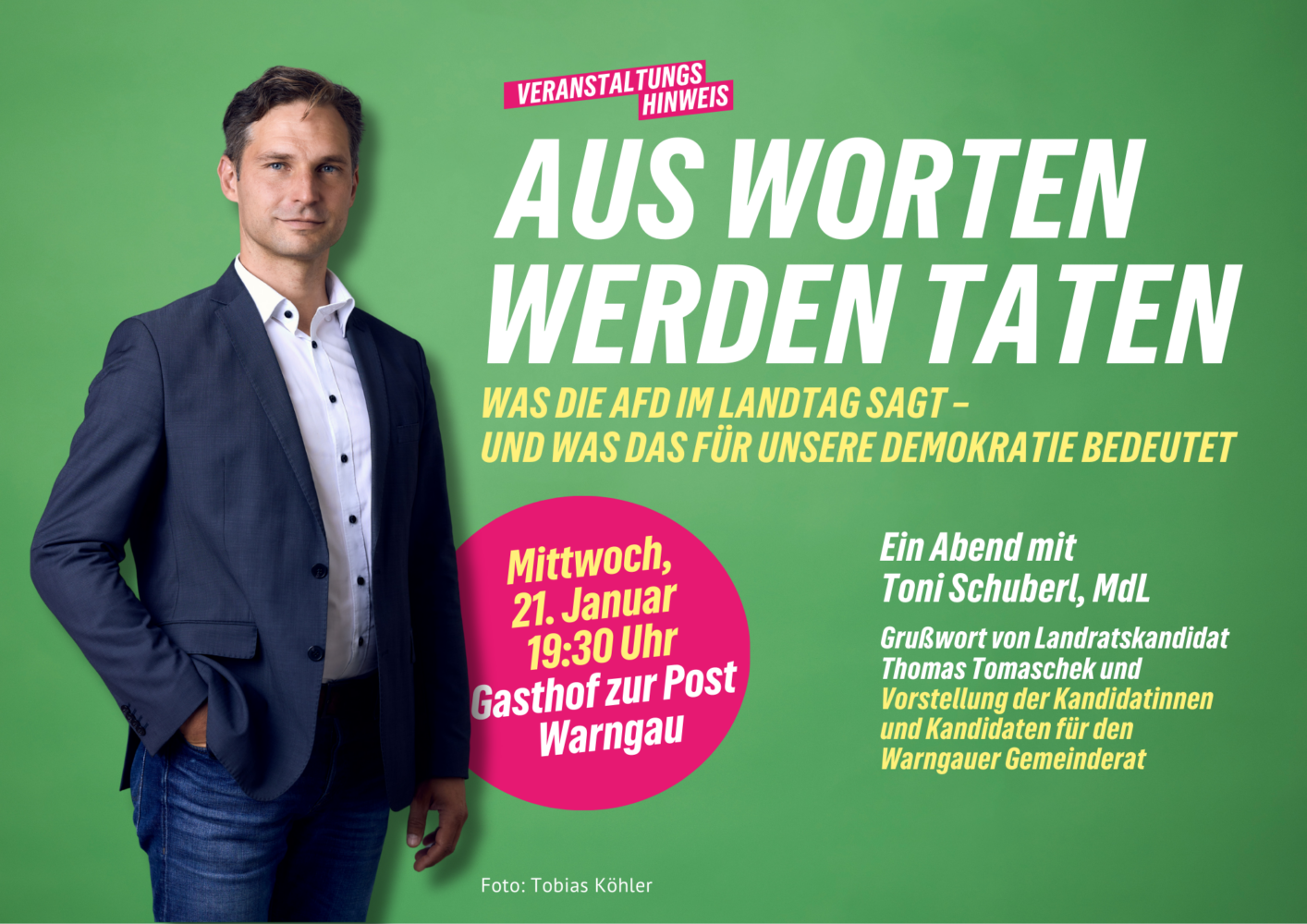 Was sagt die AfD öffentlich im Bayerischen Landtag? Und welche Folgen hat diese Sprache für unsere Demokratie? Diesen Fragen geht Toni Schuberl, MdL, am Mittwoch, 21. Januar, um 19.30 Uhr im Gasthof zur Post in Warngau nach.