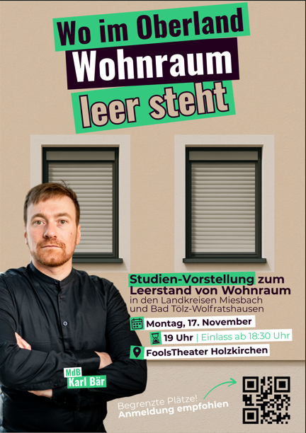 Um das Thema Wohnraummangel fundiert zu beleuchten, hat Karl Bär die Studie „Leerstand von Wohnraum in den Landkreisen Miesbach und Bad Tölz-Wolfratshausen“ in Auftrag gegeben. Die Untersuchung zeigt, wie viel Wohnraum leer steht, welche Ursachen dahinterstecken und welche Handlungsmöglichkeiten bestehen.